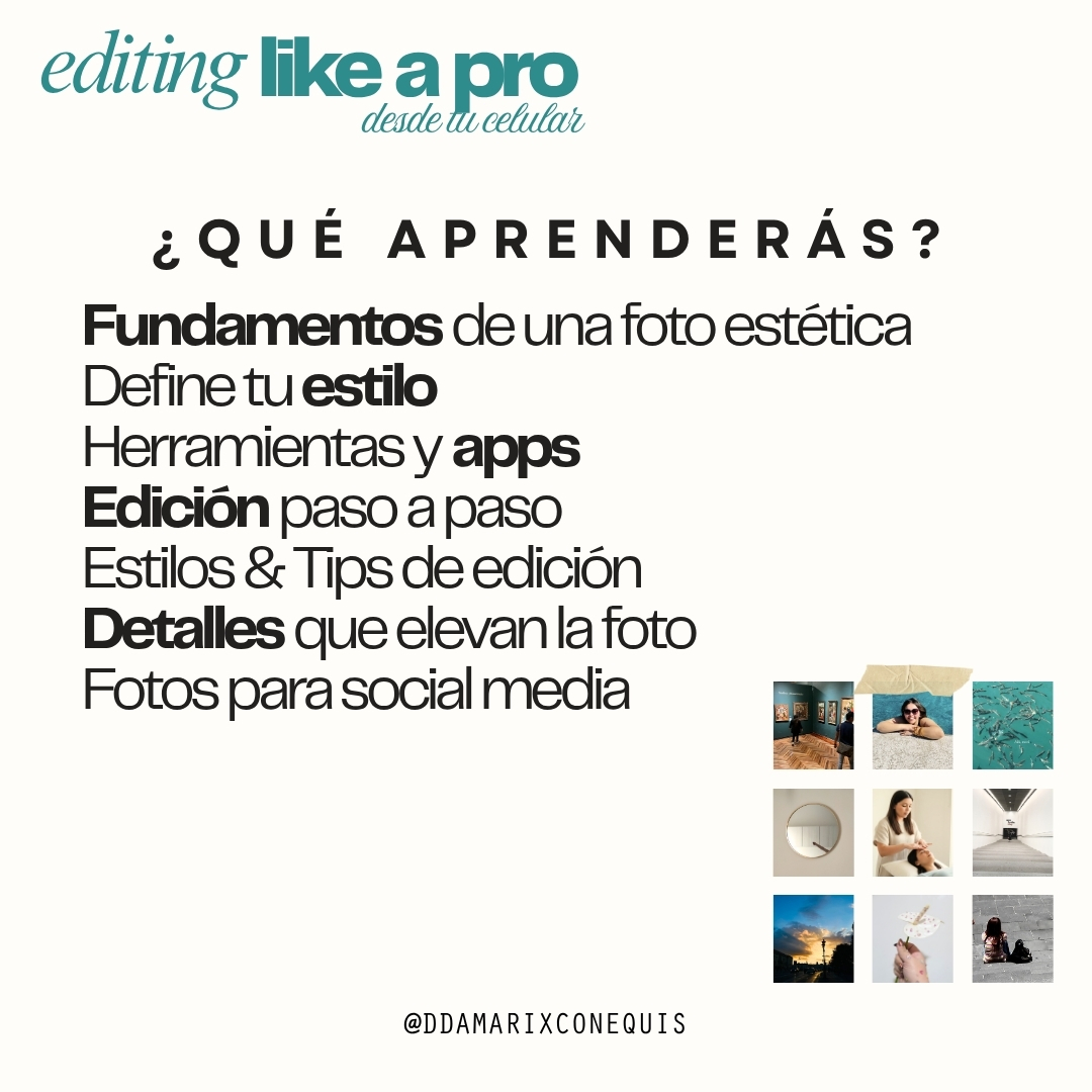 Vamos a transformar tus fotos y videos desde adentro hacia afuera: aprenderás a editar el look & feel para que se sientan más bonitas, más tuyas… y más magnéticas ✨ Y también más estéticas, coherentes y alineadas con tu marca ✨ LUNES 13 DE ABRIL - 7:00 PM CDMX